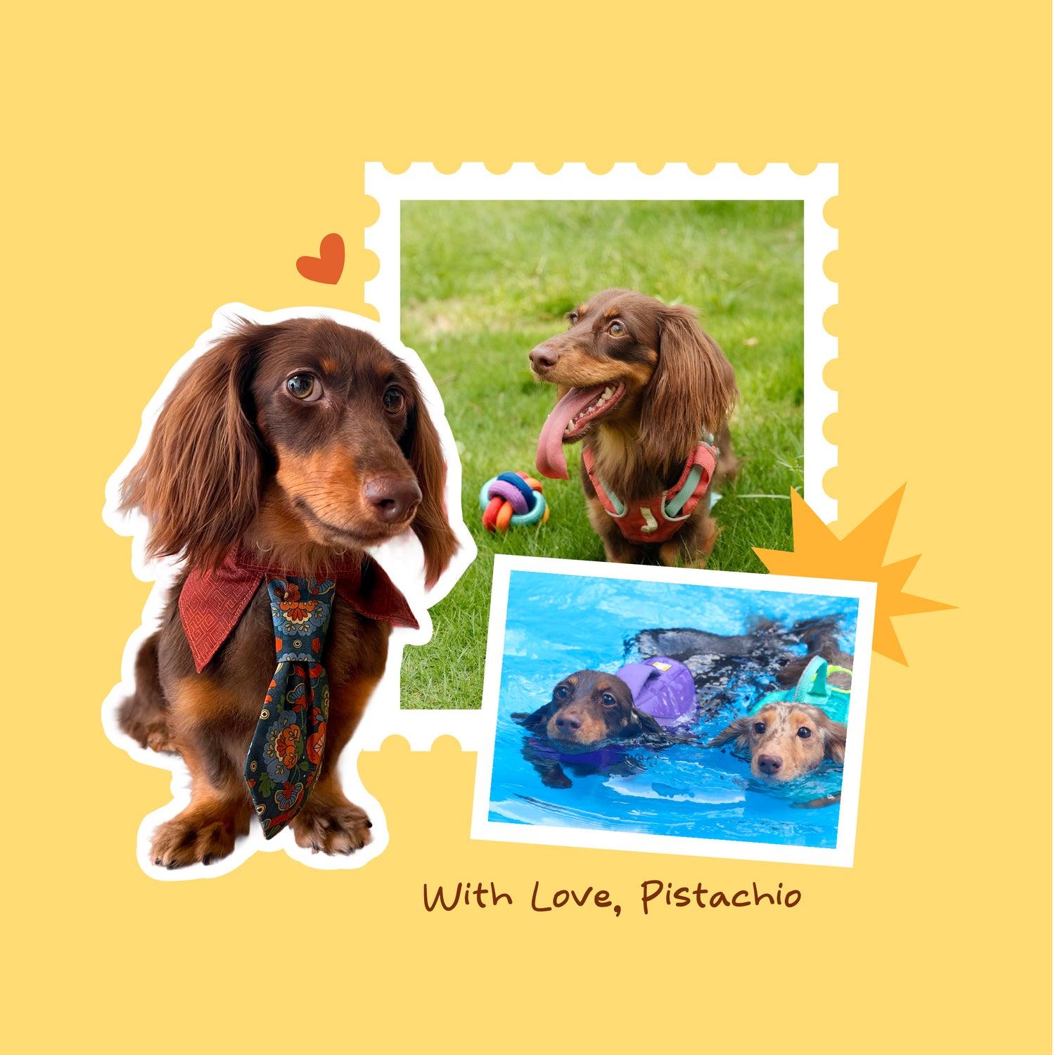 Pistachio is a chocolate-colored, long-haired dachshund, born on April 14, 2024. She’s an excellent swimmer, and nothing makes her happier than running wild with her bestie Bonnie (also a dachshund:)).